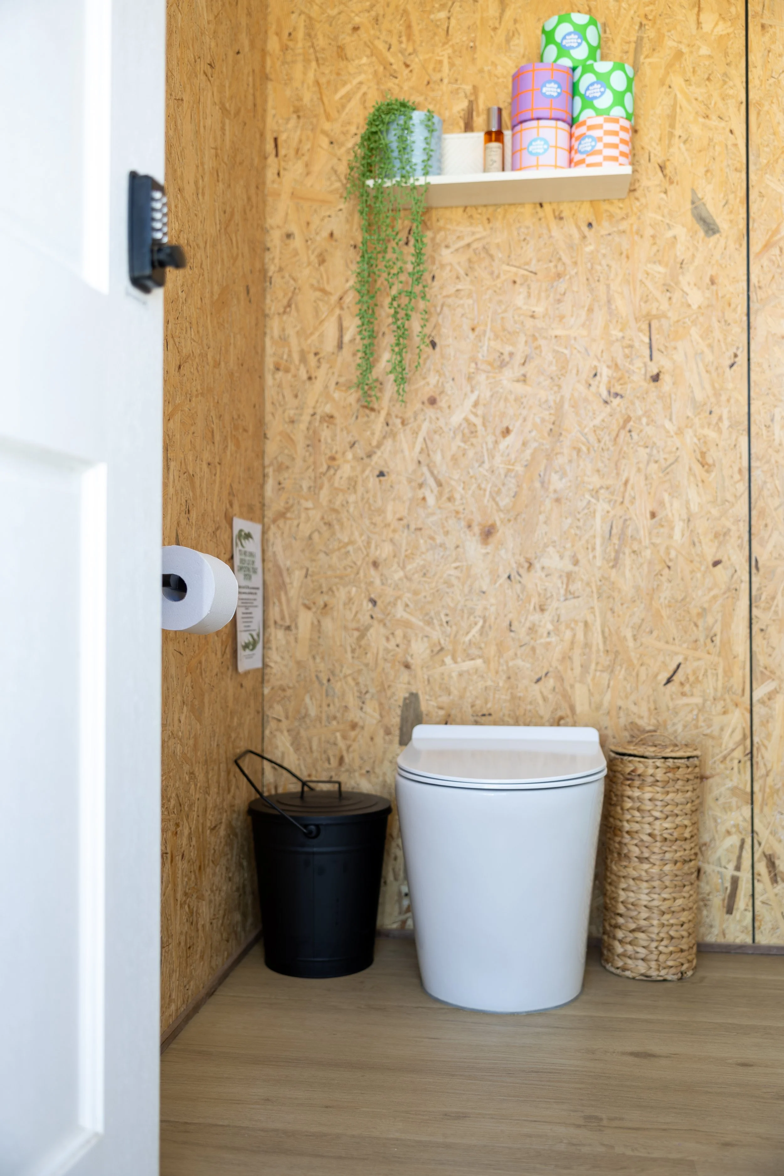 Our private ensuite was handmade by our brother-in-law, Nick from Oceanside Carpentry and Kane as his off-sider and we are so proud of the design we created and the execution of craftmanship. Our indoor bathroom has a hot shower, vanity and compostable toilet. We are proud to offer an ecofriendly ensuite. Practical and safe on the environment. The best part of glamping is the luxury of bathroom facilities.